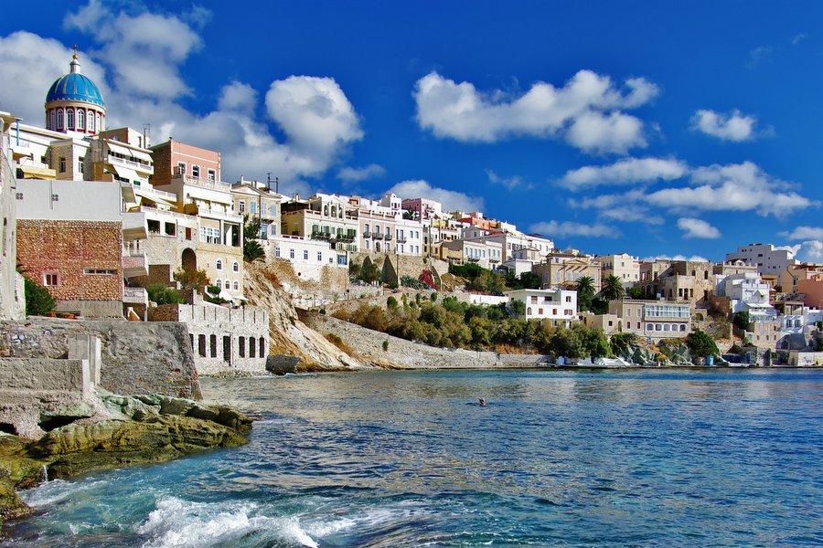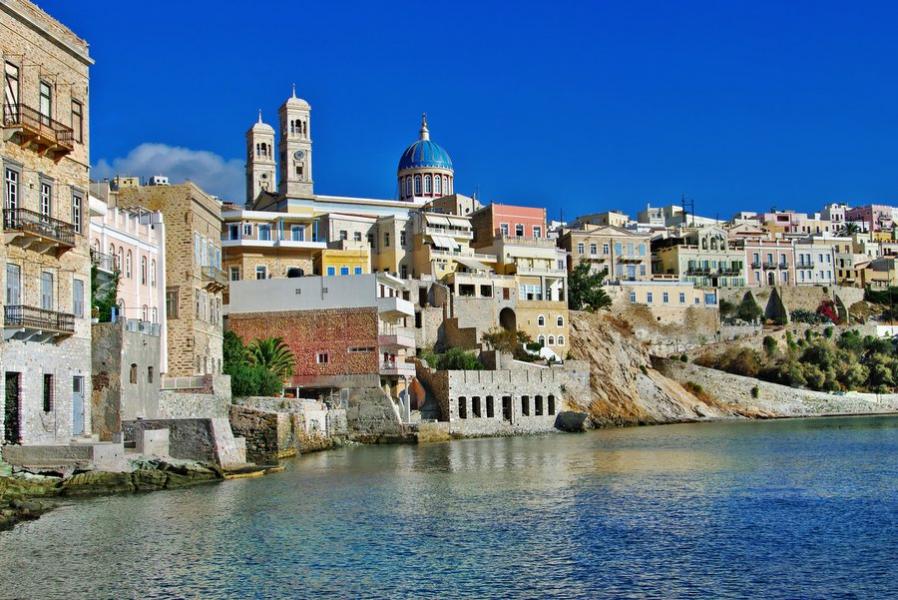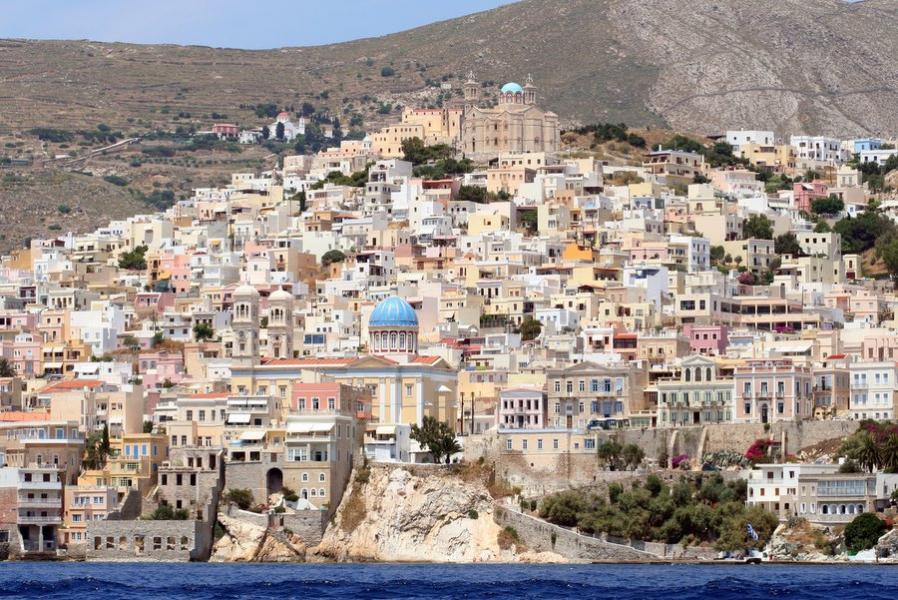 Het eiland Syros is met zijn 86 km2 oppervlakte een vreemde eend in de bijt op de Cycladen. Waar alle andere eilanden gekenmerkt worden door de witte kubushuisjes heeft Syros statige herenhuizen in neo-klassieke en Venetiaanse stijl in de hoofdstad (Ermoupolis) staan. Syros heeft 20.000 inwoners en heeft met Ermoupolis de hoofdstad van de Cycladen in huis. Het binnenvaren van deze chique hoofdstad is erg indrukwekkend. De stad is op twee heuvels gebouwd en loopt tot aan zee. Op de top van de heuvels staan twee kerken, een Orthodoxe en een Rooms Katholieke.