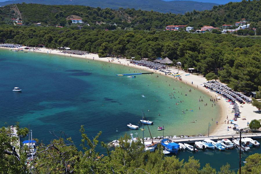 Vanuit Skiathos stad gaat er erg regelmatig een bus die bij bijna elk strand aan de zuidoostkant stopt. Het bekendste en meest bezochte strand is Koukounaries. Het wordt als één van de mooiste van Griekenland bestempeld, bestaat uit goudkleurig zand en is omringd door pijnbomen.